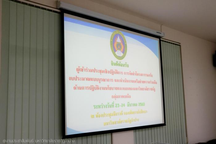 (23 มี.ค.60) ที่ห้องประชุมลีลาวดี กองพัฒนานักศึกษา มหาวิทยาลัยราชภัฏลำปาง รองศาสตราจารย์ ดร.สมเกียรติ สายธนู อธิการบดีมหาวิทยาลัยราชภัฏลำปาง เป็นประธานเปิดการประชุมเชิงปฏิบัติการ เพื่อจัดทำข้อเสนอการพัฒนาจุดเน้น มหาวิทยาลัยราชภัฏกลุ่มภาคเหนือ โดยคณะผู้บริหาร, ผู้อำนวยการกองนโยบายและแผน, หัวหน้างานแผนยุทธศาสตร์, นักวิเคราะห์, และบุคลากรที่เกี่ยวข้องเข้าร่วมประชุมเชิงปฏิบัติการดังกล่าว สำหรับการประชุมเชิงปฏิบัติการ เพื่อจัดทำข้อเสนอการพัฒนาจุดเน้น มหาวิทยาลัยราชภัฏกลุ่มภาคเหนือ ประกอบด้วย มหาวิทยาลัยราชภัชเชียงราย, มหาวิทยาลัยราชภัฏเชียงใหม่, มหาวิทยาลัยราชภัฏนครสวรรค์, มหาวิทยาลัยราชภัฏพิบูลสงคราม, มหาวิทยาลัยราชภัฏเพชรบูรณ์, และมหาวิทยาลัยราชภัฏลำปาง ภาพ/ข่าว : จตุพร โปธาคำ